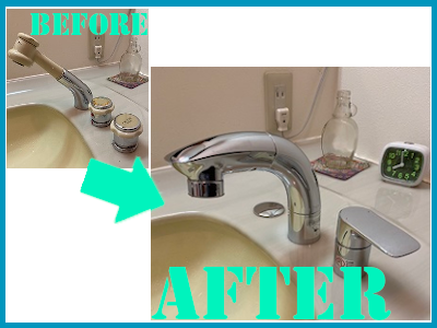 お客様との相談の末、蛇口の交換をさせて頂くことに決まり、シングルレバーのハンドシャワータイプの蛇口に交換です!
