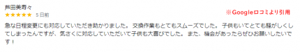急な日程変更にも対応していただき助かりました。 交換作業もとてもスムーズでした。 子供もいてとても騒がしくしてしまったんですが、気さくに対応していただいて子供も大喜びでした。 また、機会があったらぜひお願いしたいです!
